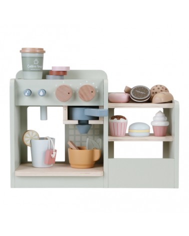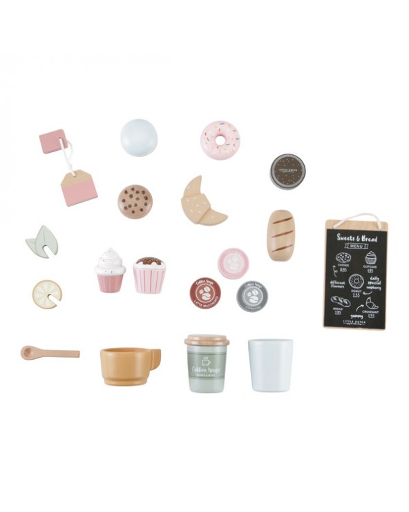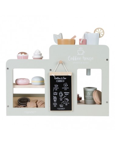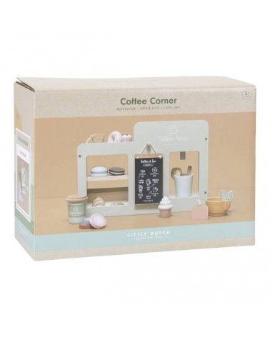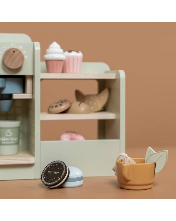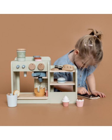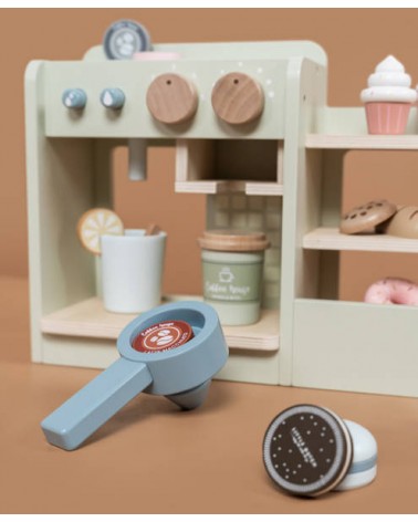 Dzięki drewnianej kawiarence Twoje dziecko zamieni się w prawdziwego baristę. Z tym uroczym zestawem Ty i Twoje dziecko możecie mieć Waszą ulubioną kawiarnię w swoim domu. Twoje dziecko z przyjemnością przygotuje pyszne napoje i ciasteczka na miejscu i na wynos. W kąciku kawowym znajduje się ekspres do kawy i herbaty, schowek na wszystkie kubki i inne niezbędne artykuły, witryna na przekąski oraz tablica z menu. Liczne akcesoria, takie jak rogaliki, pączki, torebki z herbatą i naboje z różnymi rodzajami kawy zapewnią wiele godzin cudownej zabawy.
