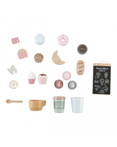 Kawiarenka i wszystkie akcesoria (19 sztuk) wykonane są z drewna z certyfikatem FSC i pokryte bezpieczną farbą na bazie wody w uroczych, pastelowych kolorach. Zabawka pobudza kreatywność i zdolności motoryczne oraz pozwala dzieciom uwolnić wyobraźnię.