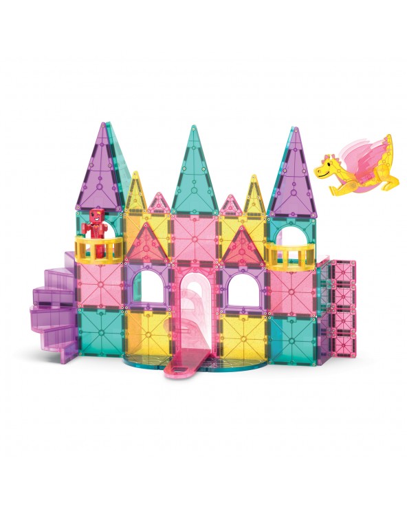Co jest w zestawie: 48 magnetycznych elementów, w tym: 1 most zwodzony, 1 figurka smoka, 1 figurka królewska, 2 spiralne schody, 2 balkony, 4 okna, 2 trójkąty równoboczne (błyszczące), 2 ćwierćkoła, 5 trójkątów równoramiennych, 20 kwadratów (10 błyszczących, 10 standardowych), 2 trójkąty równoboczne microMAGS, 4 kwadraty microMAGS i 2 trójkąty równoramienne microMAGS.