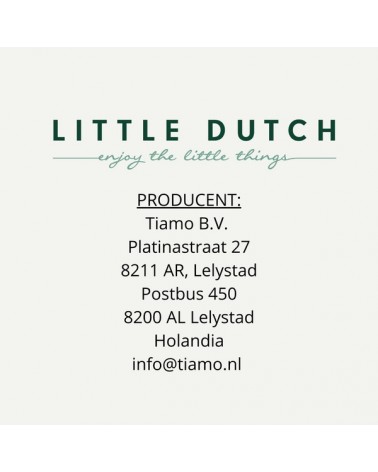 Little Dutch to holenderska firma rodzinna, prowadzona przez małżeństwo, które wkłada całe serce w tworzenie produktów dla najmłodszych. W ofercie marki znajdują się doskonałej jakości tekstylia, produkowane z bawełny organicznej z certyfikatem Oeko-tex, takie jak ręczniki, śpiworki do spania, otulacze, akcesoria do pokoików dziecięcych oraz zabawki sensoryczne dla niemowląt, jak również zabawki czy pojazdy wytwarzane z drewna. Produkty Little Dutch cechuje spokojna, pastelowa kolorystyka.