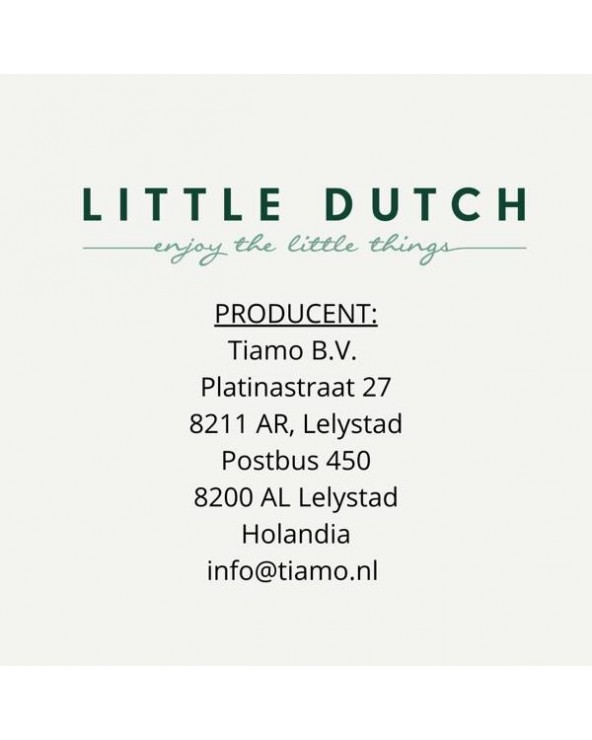 Little Dutch to holenderska firma rodzinna, prowadzona przez małżeństwo, które wkłada całe serce w tworzenie produktów dla najmłodszych. W ofercie marki znajdują się doskonałej jakości tekstylia, produkowane z bawełny organicznej z certyfikatem Oeko-tex, takie jak ręczniki, śpiworki do spania, otulacze, akcesoria do pokoików dziecięcych oraz zabawki sensoryczne dla niemowląt, jak również zabawki, czy pojazdy wytwarzane z drewna. Produkty Little Dutch cechuje spokojna, pastelowa kolorystyka.