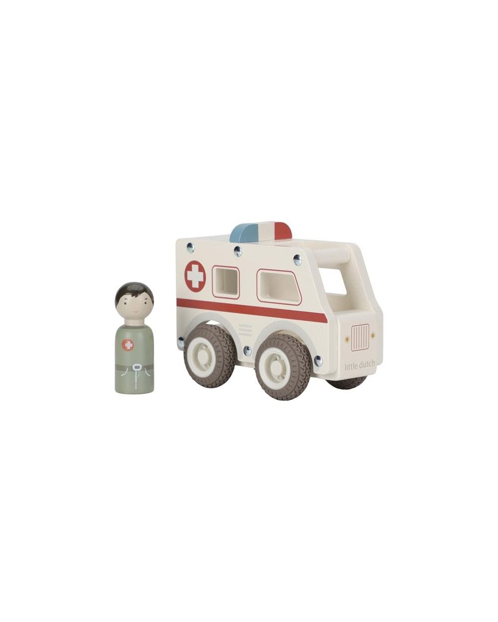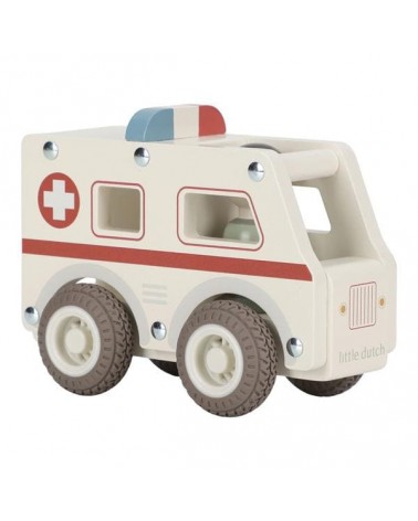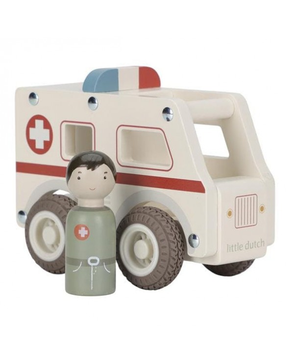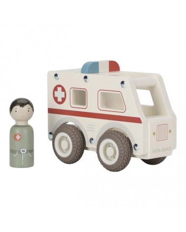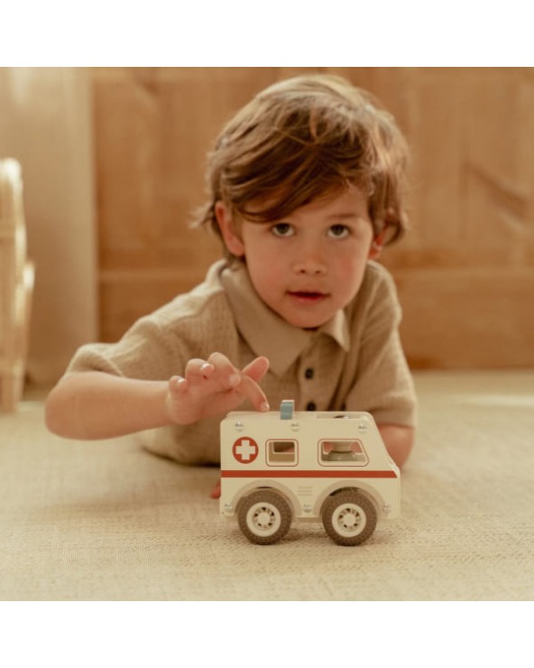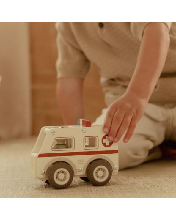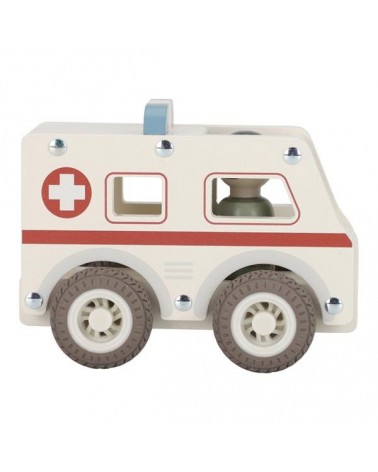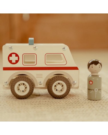 Drewniane auto ambulans z wyjmowanym ludzikiem. Wykonane z drewna, pomalowane bezpiecznymi farbami na bazie wody. Łatwy i wygodny do chwytania przez małe rączki.
